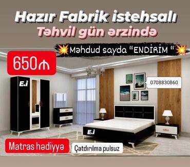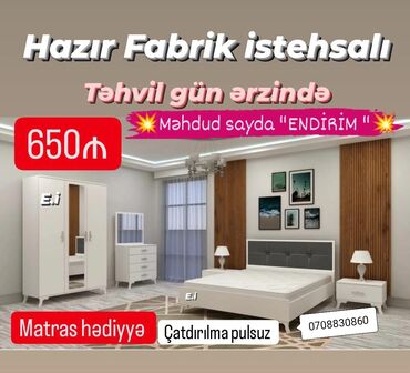 Yataq otağı dəsti Tərkib: - İki nəfərlik çarpayı: Yüksək, parça başlıq (bənövşəyi rəng, düyməli dekor), başlıqda inteqrə edilmiş rəflər. Hündür ayaqlı konstruksiya. - İki ədəd tumbə: Ağ və tünd şa...