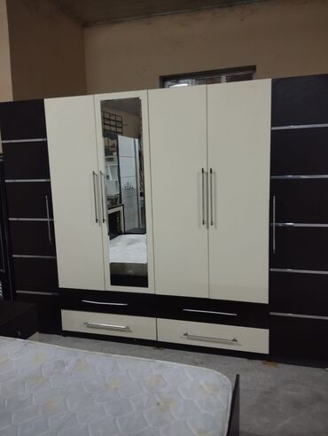 Yataq otağı dəsti Tərkibi: - 4 qapılı geyim dolabı – ortada 2 böyük güzgülü qapı, yanlarda asılqan bölmələri; aşağı hissədə 4 çekmece. Tünd ağac teksturası və ağ dekor panelləri, metal tutacaqlar....