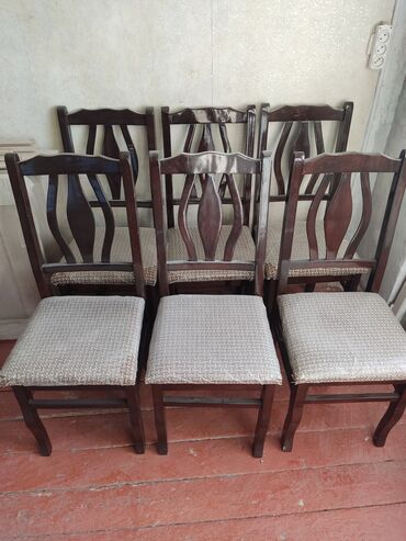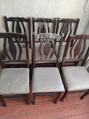- Stullar: tünd ağac gövdə, klassik kəsimli arxa dayaqlar; yumşaq oturacaq hissəsi – xırda naxışlı açıq-boz parça ilə çəkilib.