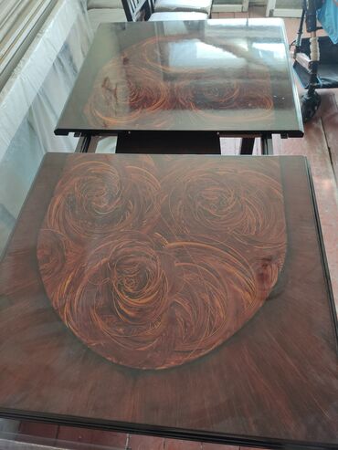 - Masa: düzbucaqlı forma, üstü şüşə ilə örtülmüş dekorativ naxışlı səth; iki tərəfdən sürüşdürülərək genişlənən mexanizm (ekranlarda açıq vəziyyəti görünür); tünd rəngli karkas və ayaqlar.