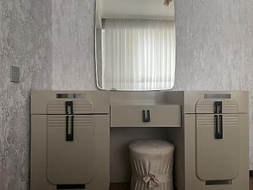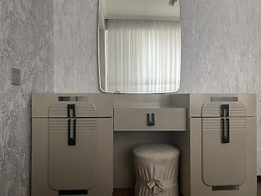 - Komplekt: böyük asma güzgü, ortada çekmecəli masa hissəsi, iki tərəfdə qapılı şkaf bölmələri, yumşaq oturacaq (ağ-bej parça, ətəkli, lentli)