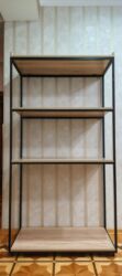 Sənaye üslubunda açıq rəf sistemi - Dizayn: Qara metal karkas + ağac teksturalı lövhələr (dörd səviyyəli). - Ölçü təxmini: standart otaq hündürlüyündən alçaq, dərin və geniş rəflər; böyük həcmli ə...