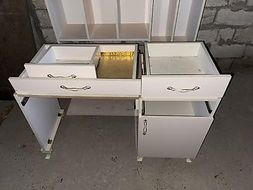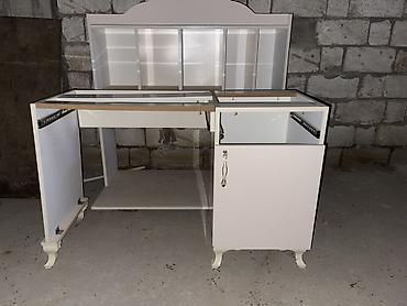 Ağ rəngdə komod-masa - Material: laminat/LDSP ağ dekor - Dizayn: sol tərəfdə 3 ədəd siyirtmə (oval metal dəstəklər), sağ tərəfdə açıq rəf bloku - İstifadə: iş masası, makiyaj masası və ya konsol ki...