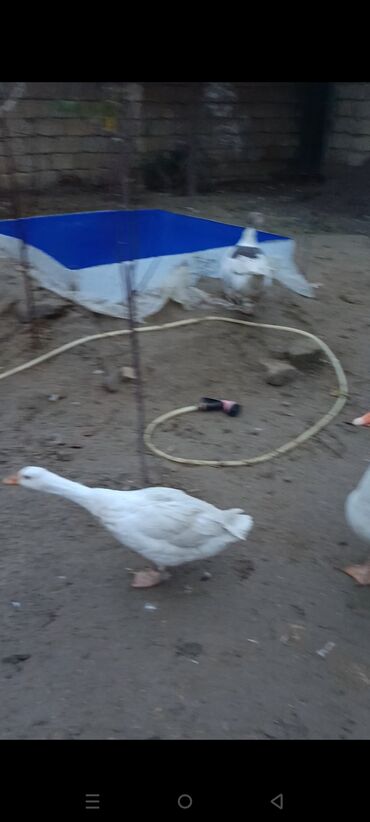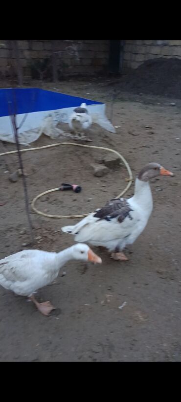 Məhsul: Qaz və ördək (şəxsi təsərrüfatdan) Təsvir: - Şəkillərdə iki ədəd ağırlıqlı, ağ rəngli qaz görünür; uzun boyunlu, narıncı dimdik və pəncələr, bədəndə zəif boz ləkələr. - Ayrı şəkildə boz-ağ...