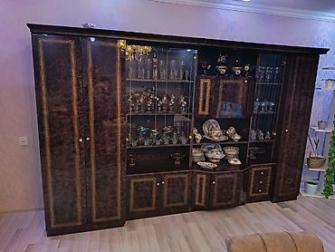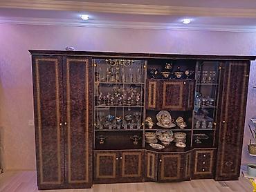 Təxmini ölçülər (vizual): hündürlük təqr. 2,2–2,4 m, ümumi eni təqr. 3,5–4 m, dərinlik 45–55 sm. Montajı modul hissələrdən ibarətdir, ikiqat şüşə vitrin qapıları sayəsində ekspozisiya effekti yaradır.Qeyd: şəkillərdə göstərilən qab-qacaq və dekor nümunə kimi yerləşdirilib; mebelin vitrin və rəf tutumu haqqında fikir vermək üçündür.