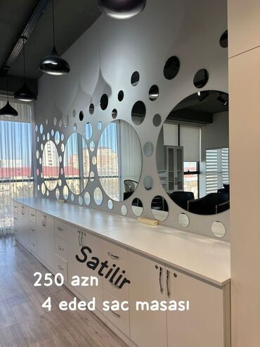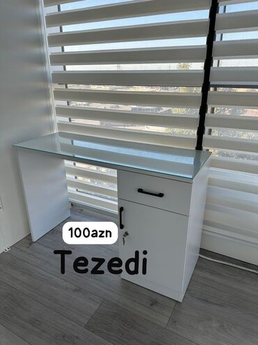 - Kompakt masa/tumba: ağ rəngli, üstü şüşə səth, bir çekmece və kilidli dolab bölməsi var. Kiçik iş sahələri üçün rahatdır. Şəkildə qeyd olunan qiymət: 100 AZN. “Təzədi” qeydi mövcuddur.