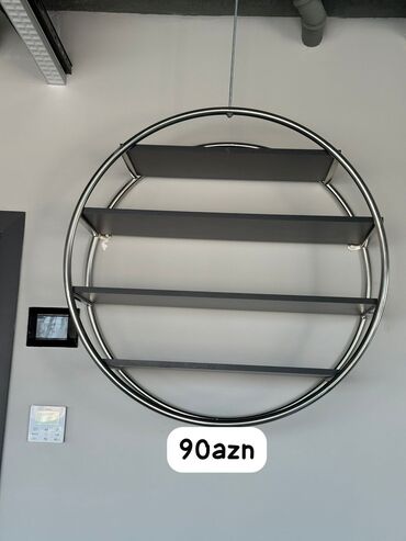 - Dairəvi divar rəfi: metal halqa karkas, içərisində 3 ədəd üfüqi polka. Dekor, kitab və aksessuar üçün uyğundur. Qiymət: 90 AZN (şəkildə göstərilib).