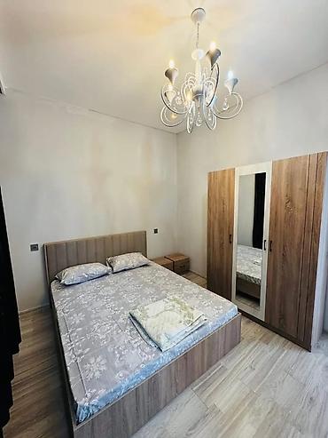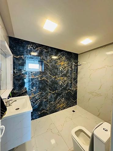 - Döşəmələr: parlaq mərmər naxışlı kafel (mətbəx və qonaq otağı), otaqlarda laminat