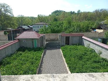 - Sahə/hasar: həyətyanı torpaq bütövlükdə hündür beton hasarla əhatələnib, dekorativ qırmızı dam örtüklü kənar divarlar və dəmir darvaza.