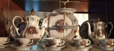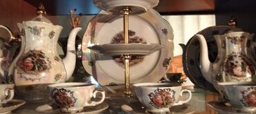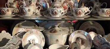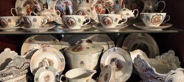 - Arxa fonda uyğun boşqablar komplekti: dərin və yemək boşqabları, mərkəzdə klassik rəsmlərlə.