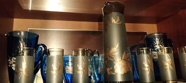 - İki fərqli üslubda qrafin: dərin mavi şüşədən və boz-mat örtüklü, qızılı naxışlarla.