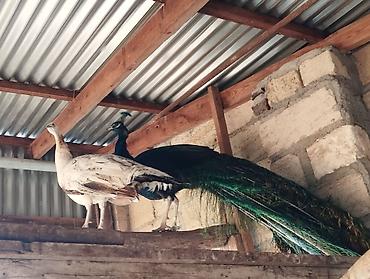 - Şəkillərdə göründüyü kimi bir cüt tovuz quşu: parlaq mavi-yaşıl tüklü erkək və açıq rəngli dişi.