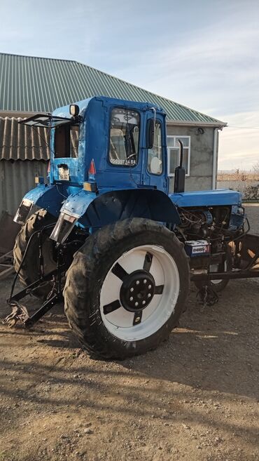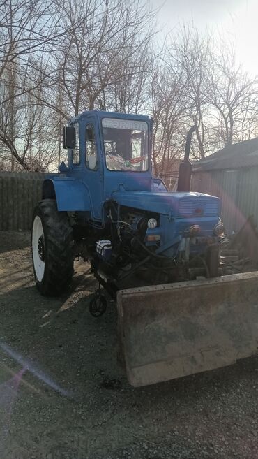 Mavi rəngli təkərli traktor – ön bıçaqlı (buldozer tipli) universal kənd təsərrüfatı və təsərrüfat işləri üçün.
