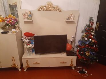 - TV stendi: iki iri çekmecəli alt baza, üzərində geniş panel (panelin yuxarısında qızılı ornament); hər iki tərəfdə dekorativ ayaqlar; paneldə iki kiçik dekorativ rəf.
