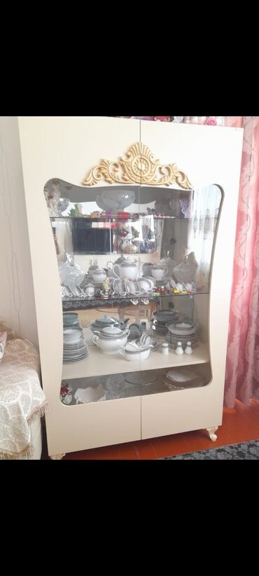 - Dar vitrin: bir qapılı, şüşə önlük və şüşə rəflərlə; yuxarıda qızılı oyma dekor, alt bölmə; eyni üslubda dekorativ ayaqlar.