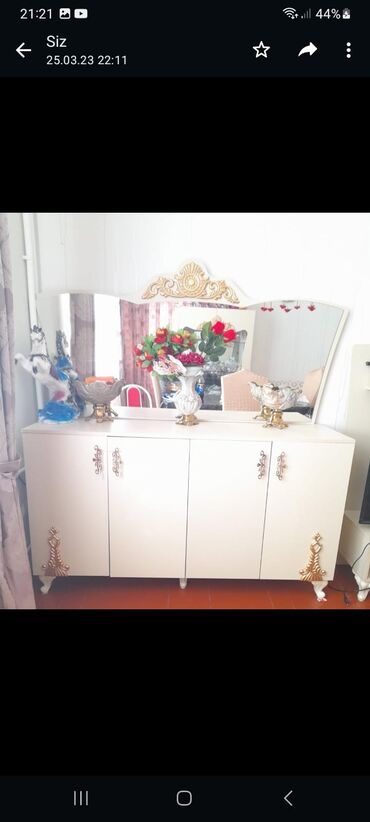 - Konsol/komod və güzgü: dörd qapılı komod, qızılı dekorlu tutacaqlar və künc bəzəkləri; üzərində iri dekorativ güzgü (yuxarı hissəsi dalğalı formadadır, qızılı ornamentlə).