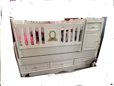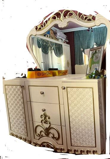 - Komod güzgü ilə: iri dekorativ güzgü, mərkəzdə üç çekmece, iki yan qapı; üzərində klassik qızılı işləmələr.