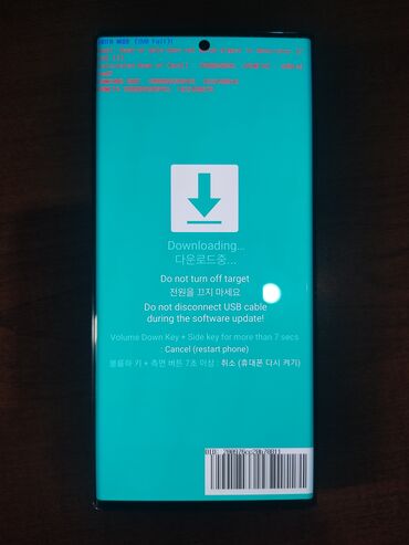 - Ekranda “Downloading… Do not turn off target” (Odin/Download Mode) ekranı görüntülənir – proqram/firmware yükləmə rejimi açılır