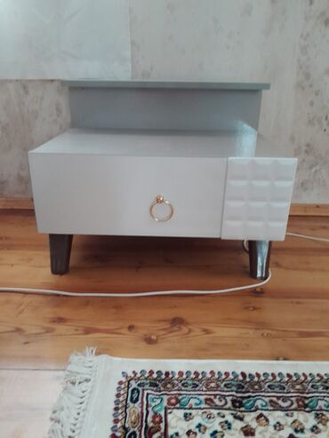 - 2 ədəd tumbə: parlaq ağ-boz səth, qızılı halqalı tutacaqlar, sağ küncdə relyefli dekor panel, konus ayaqlar.