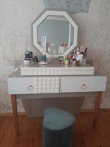 - Vizaj/komod masası: iki çekmecəli, eyni dekorlu relyef panellər və qızılı halqa tutacaqlar. Üst hissədə səkkizguşəli (oktaqon) güzgü çərçivəsi, masa üstü genişdir. Ağ-boz rəng palitrası.