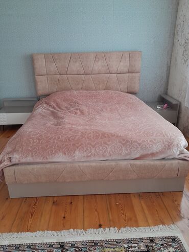 - Yumşaq başlıqlı iki nəfərlik çarpayı: parça üzlü, dekorativ romb tikişli başlıq, alt hissəsi qapalı baza. Rənglər – açıq bej və boz tonları.