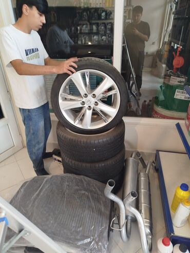 Məhsul: Alüminium disk + təkər komplekti - Disk: çoxşüalı dizayn, 5 bolt deşikli (5x… ölçülü bolt düzümü, mərkəz dəliyi qapaqsız). Rəng: gümüş/qaranlıq boz ikirəng. - Ölçü: təxmini 18" (şinanın pr...