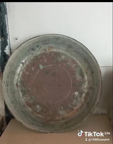 - Köhnə mis/trəvdə böyük sini: dairəvi forma, mərkəzdə oyma naxışlı rozet, kənarlarda klassik zərb xətləri. Təbii patina qalır.