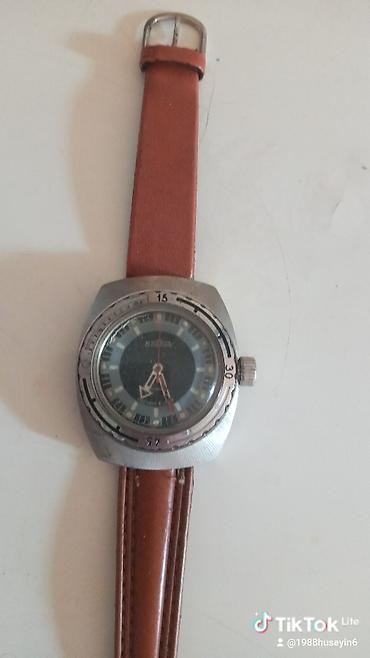 - Mexaniki qol saatı “Vostok” (Amfibiya üslubu): dəyirmi qara siferblat, işarələr və saat əlləri lum örtüklü, dönər bezel (0–60 işarəli), yan kron, qəhvəyi dəri qayış.
