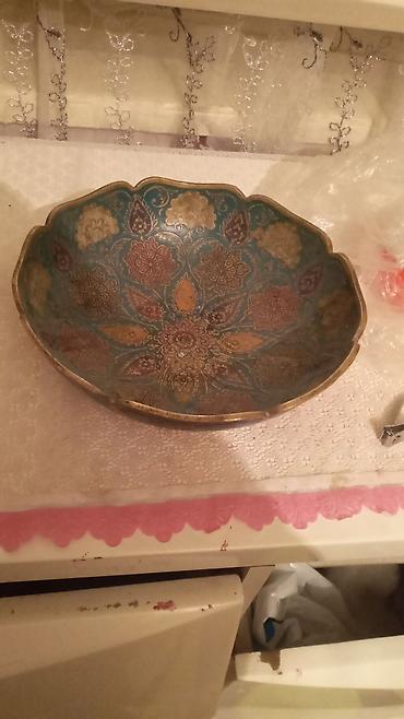 - Əl işi bəzəkli metal/klinker kasa: iç səthində şaxələnən floral ornamentlər, çoxrəngli emal (mavi-yaşıl fon, qızılı və qırmızı naxışlar), dalğalı kənar forması. Mərkəzdən radial şəkildə işlənmiş gül motivləri, kənarlarda relyef xəttlər.
