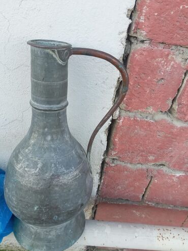 Antik mis su qabı (ibrik) - Material: döymə mis - Forma: uzun dar lüləli, geniş qarnı və arxa tərəfdə qövsvari tutacağı olan klassik ibrik dizaynı - İstifadə sahəsi: su, şərbət və digər mayelərin ...