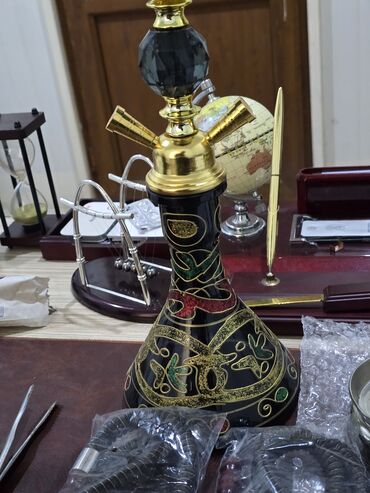 - Material: pirinç/qızılı rəngli metal gövdə, seramik kasacıq, qalın şüşə kolba (qara fon üzərində qızılı, yaşıl və qırmızı naxışlar).