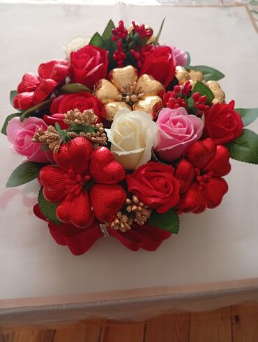 - İkinci variantda qızılı folqa dekorları və ürək formalı qırmızı elementlər əlavə edilib, buketə bayram abu-havası verir.