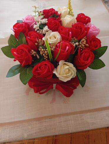 - Kompozisiyada müxtəlif rəngli qızılgül süni çiçəkləri, yaşıl yarpaqlar, dekorativ qızılı elementlər və qırmızı giləmeyvə detallarından istifadə olunub.