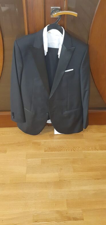 Kişi smokinq dəsti – Emiland (Made in Azerbaijan) - Rəng: qara - Parça: 100% yun; astar: 100% viskoza (etiketdə göstərilib) - Ölçü: 56 - Model: 2356 N44, Article 271370 (etiketdə) - Parlaq atlas d...