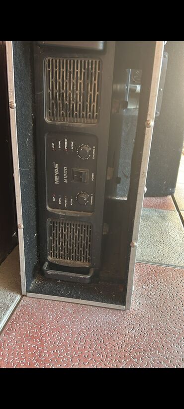 - Model: MEYAS M1200 (front paneldə göstəricilər: Clip, Signal, Protect, Active; Channel A/B səviyyə düymələri, Power açarı)