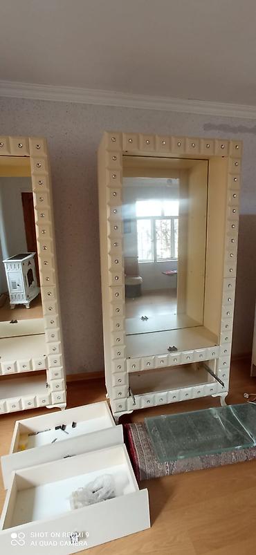 - 2 ədəd iri güzgülü vitrin/komod: hər birinin ön hissəsində iri güzgü, altda geniş rəf və çıxarılan siyirmələr. Korpusun ətrafı dekorativ kvadrat naxışlı panellərlə işlənib, kənarları klassik qıvrım ayaqlıdır.