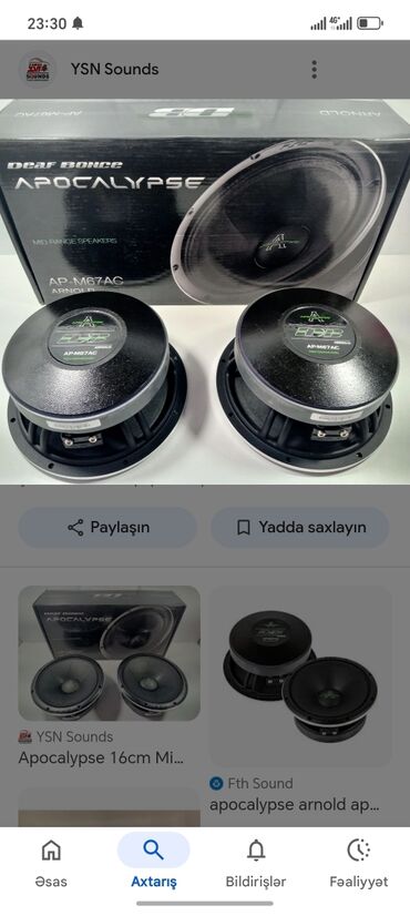 - Mid-range dinamiklər: Deaf Bonce Apocalypse Arnold seriyası, 16 sm (6.5") ölçü. Korpusda “AP-M67AC/Pro” işarələri görünür.