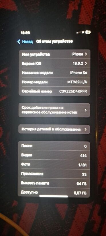 Apple IPhone XS, 64 GB, batereyasi 75%, Face ID işleyir, arxa kamerasi reqem ve herfleri bulanıq gösterir, üst ekrani deyişilib. Alanlar ancaq müraciet etsin🙏