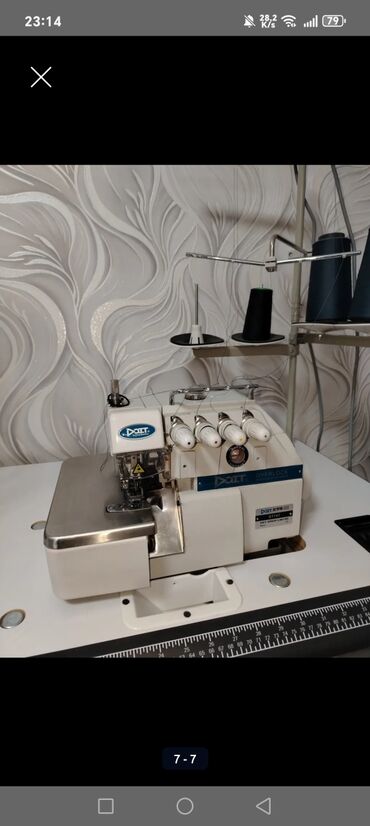 - DOIT Overlock (serj) maşını – 4 ipli/5 ipli işləməyə uyğun konstruksiya, ip kanalları rənglə işarələnib. Paslanmayan polad bıçaq örtüyü, təzyiq tənzimləyicisi, ip dayağı və bobin stendi ilə masa üzərinə quraşdırılıb.