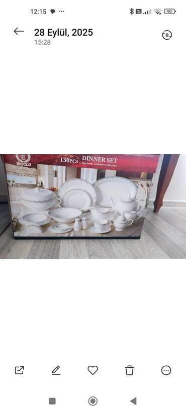 Zərif naxışlı, ağ rəngdə, klassik üslublu iri dəst. Qutusunda “130PCS DINNER SET – fine bone exclusive collection” qeyd olunur.