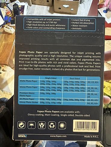 Fopex foto kağızı inkjet printerlərdə peşəkar görünüşlü, canlı rəngli və detalı fotolar üçün hazırlanıb. Xüsusi örtük sayəsində həm boya əsaslı, həm də piqment əsaslı mürəkkəblərlə aydın və real görüntülər verir. Ləkəsiz, tez quruyan və nəsillər boyu saxlanıla bilən foto çapları üçün uyğundur.