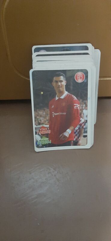 - Dəstə: fotolarda bir neçə kart yığını görünür; üzlərində müxtəlif oyunçular və komanda formaları var