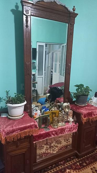 Oyma detalları və böyük güzgüsü olan qəhvəyi rəngli taxta komod. Bu komod iki böyük qapalı bölməyə və iki siyirtməyə malikdir. Güzgünün ətrafında və komodun yan tərəflərindəki oyma bəzəklər ona kla...