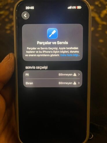 - Ekran və batareya ilə bağlı “Parçalar və Servis” bölməsində məlumat bildirişi görünür (Ekran: Bilinməyən, Pil: Bilinməyən)
