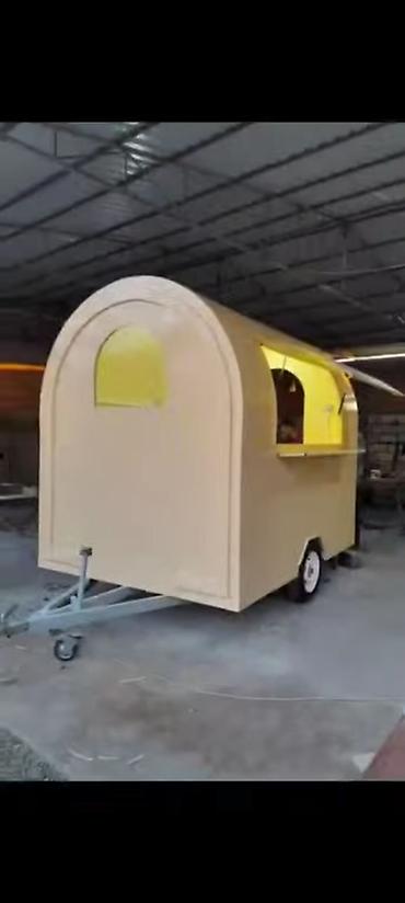 - Mobil ticarət/food-truck tipli treyler (yan tərəfdən açılan servis pəncərəsi, taxta tezgah, dartma burnu və dəstəkləyici təkər)