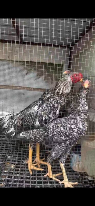 Məhsul: Yerli toyuq-quş dəsti Təsvir: - Şəkillərdə uzunboylu, əzələli gövdəli bir xoruz və yanında bir toyuq görünür. Xoruz çoxrəngli lələklərə malikdir: qara əsas fon üzərində ağ, krem və pas ton...