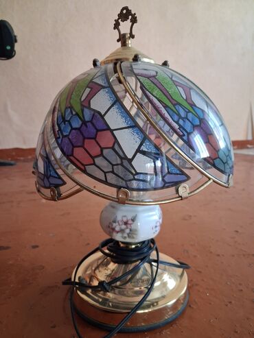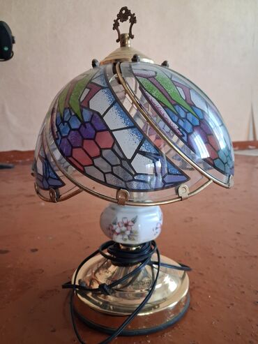 - Dizayn: Rəngli vitraj naxışlı şüşə abajur, spiral bürünc tonlu metal çərçivə ilə. Üst hissədə dekorativ tutacaq detalları var.