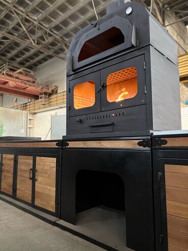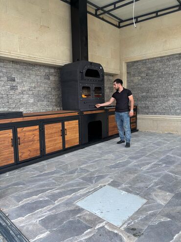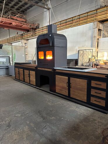 Açıq mətbəx üçün metal-odun sobası və modul kabinetli peç komplekti.