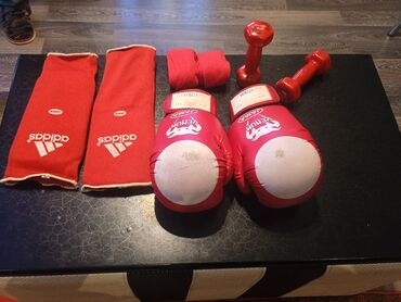 Boks və döyüş idmanı üçün tam dəst – Adidas və digər brendlər Dəstdə olanlar: - 2 cüt boks əlcəyi: qara-ağ Adidas və qırmızı-ağ Adidas - 1 cüt qara Adidas qoltuqaltı/dirsək üçün taykun (forearm/sh...