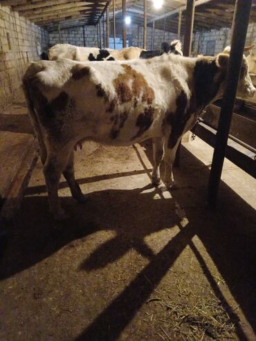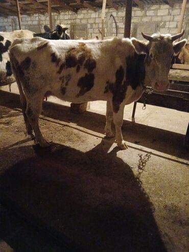 Süd istiqamətli inək Qarnında 7 aylıq balası var. 2 ci qarındl - Rəng: qəhvəyi, bədəndə ağ ləkələr - Buynuzlu, qısa buynuzlar - Sağlam, çevik bədən quruluşu, düz bel xətti - Otlaq şəraitinə uyğun, ...